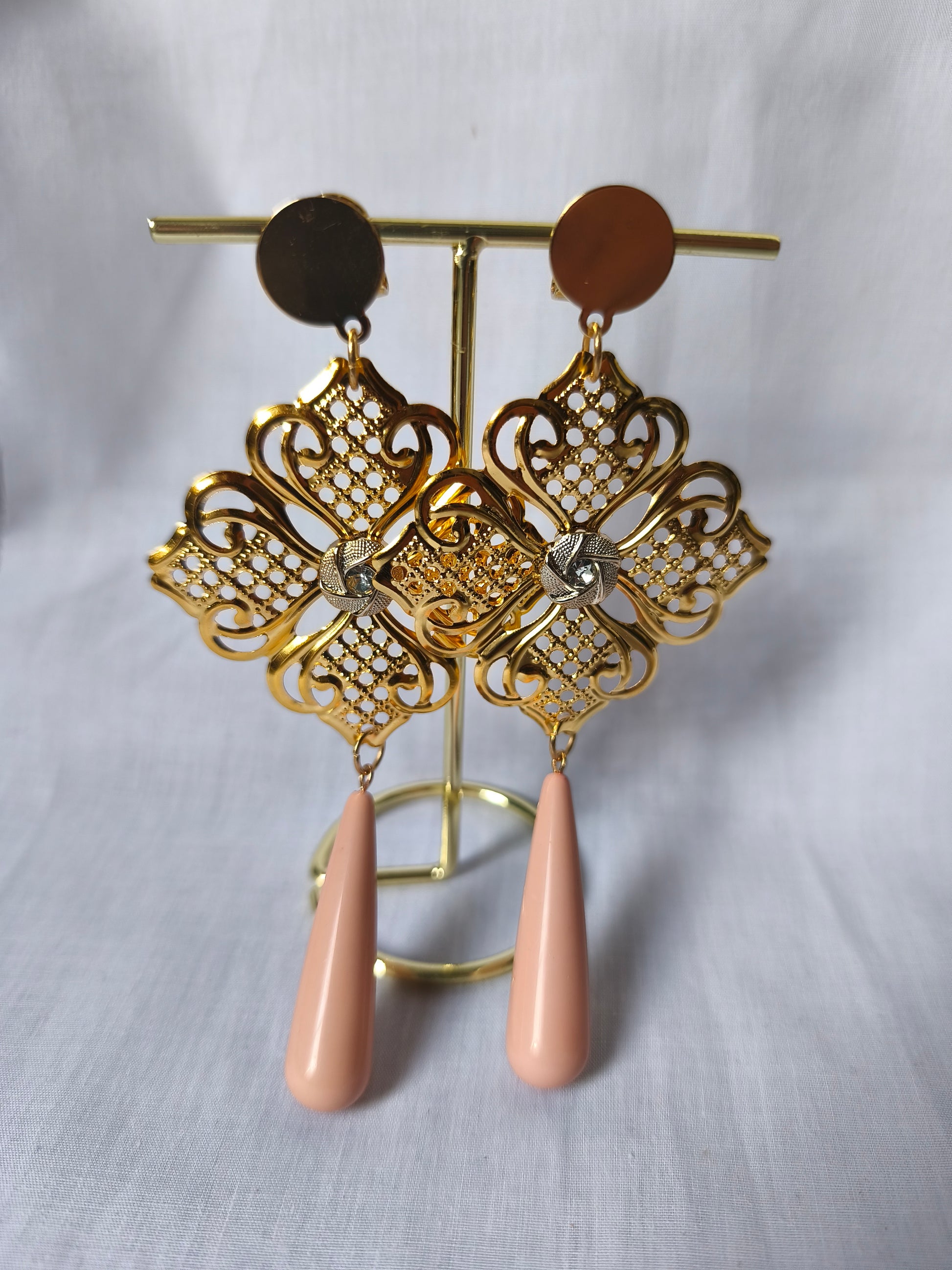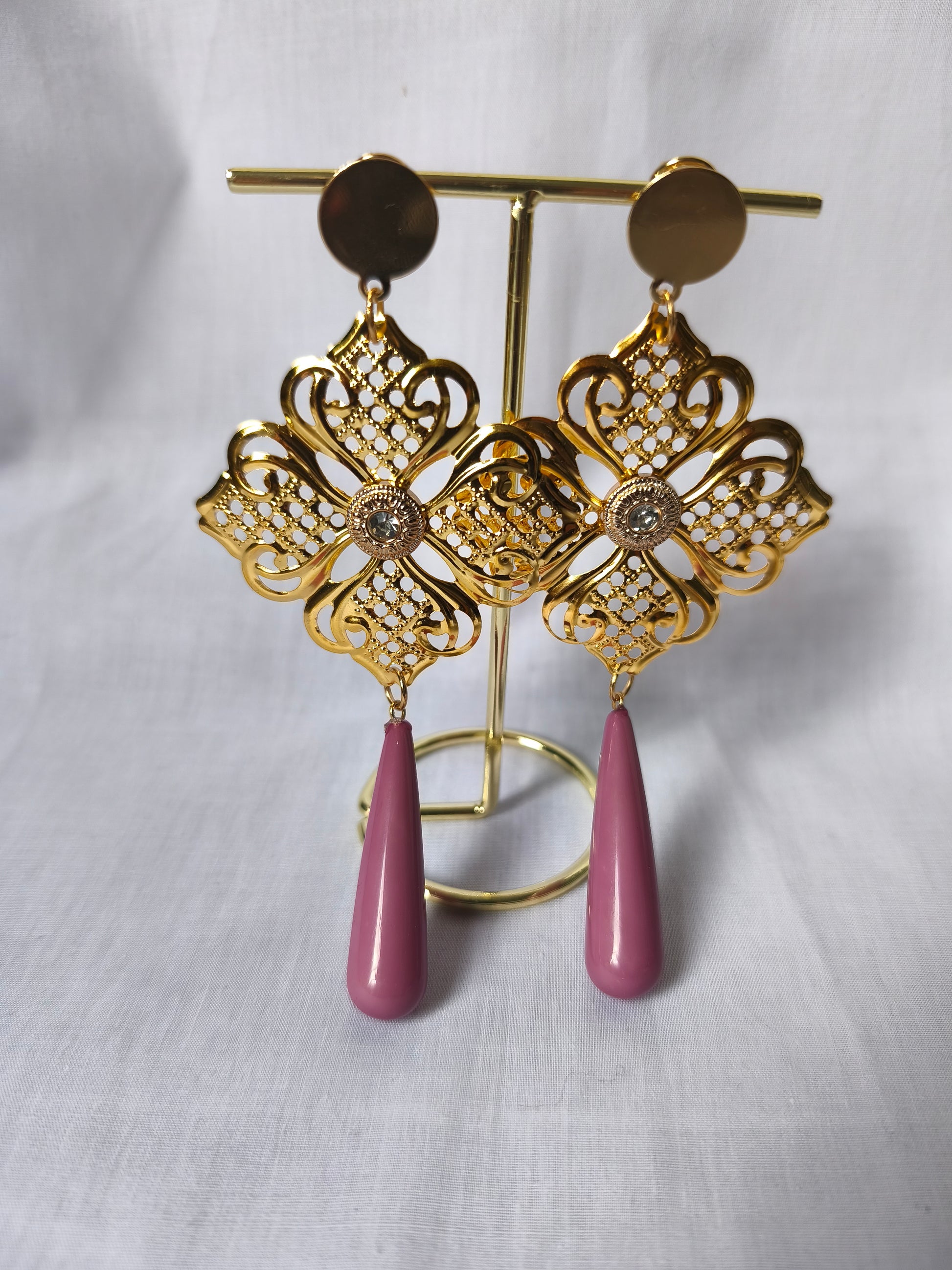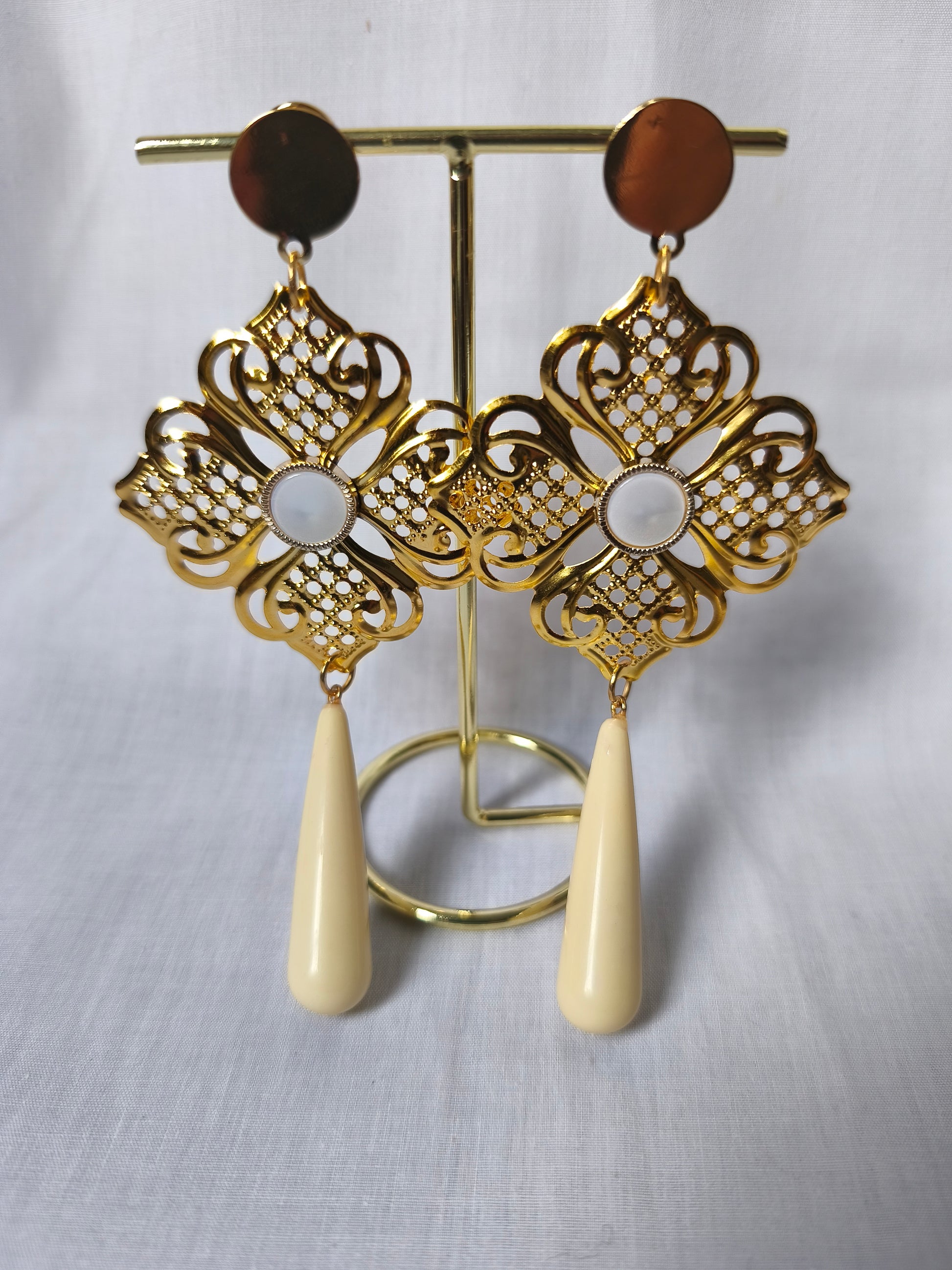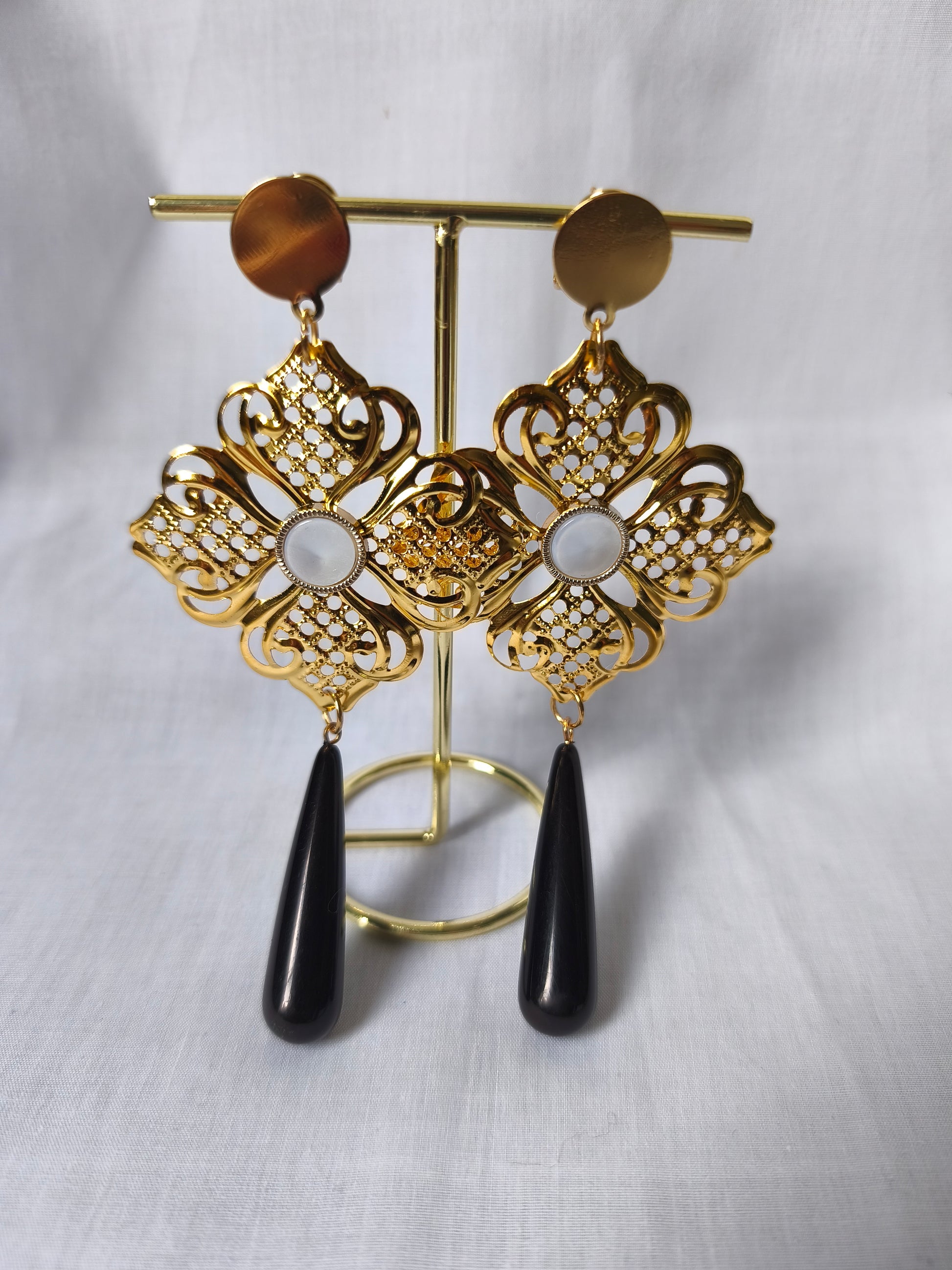 Estos pendientes de flamenca son una auténtica joya de tradición y elegancia. Destacan por su espectacular cuerpo central calado en tono dorado. Se completa con una estilizada lágrima que puedes elegir entre los distintos tonos disponibles.