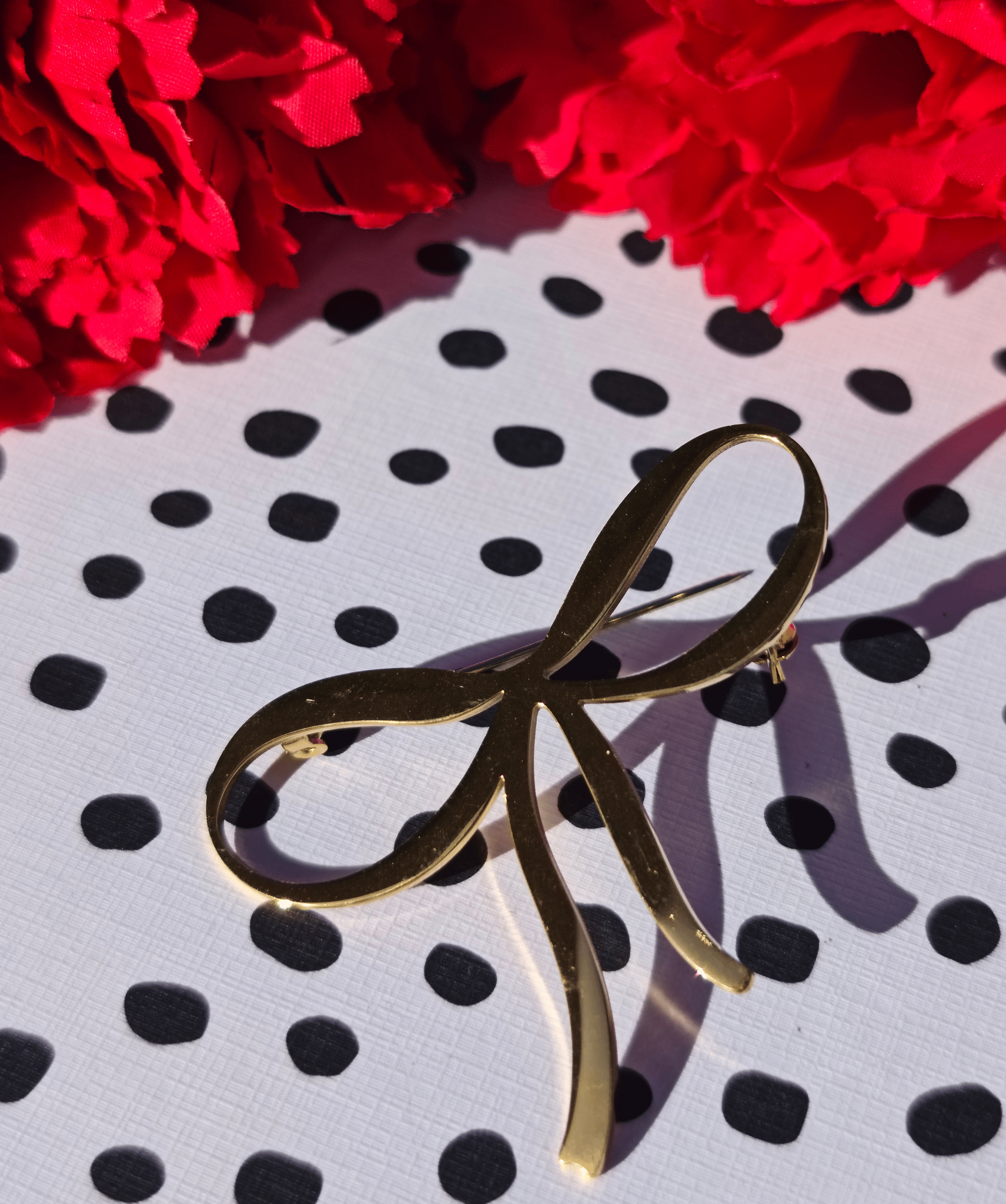 Este broche de mantoncillo con forma de lazo está elaborado en metal dorado de acabado brillante.