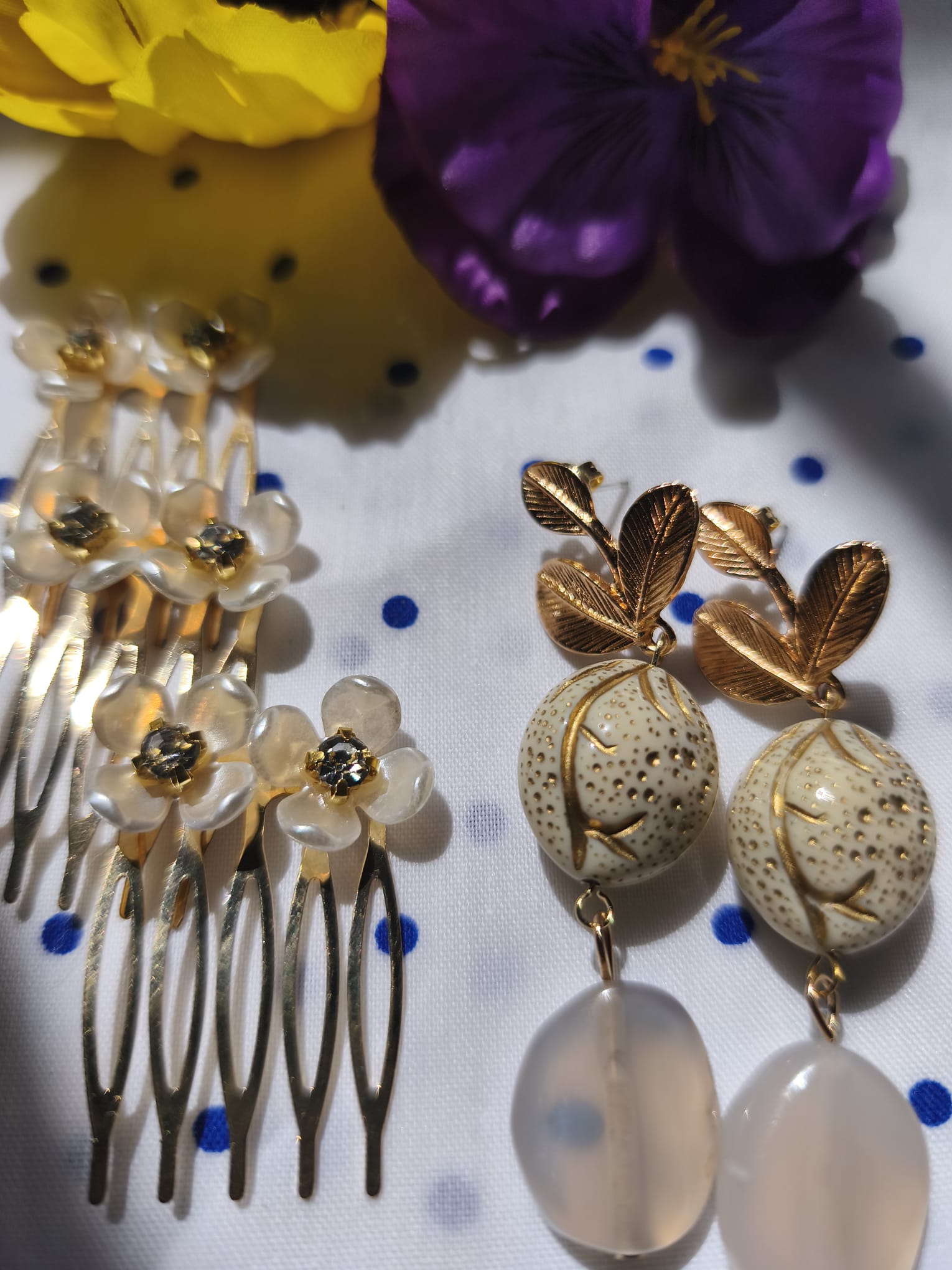 Pendientes en distintas tonalidades de blanco con cierre en forma de hojas doradas.